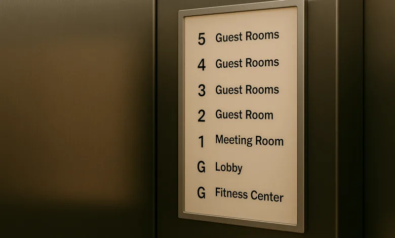 أفضل المصاعد الفندقية هي تلك التي تُخبرك فقط بما تحتاجه الآن: موقعك، الطابق المتوجه إليه، وربما خريطة بسيطة للمرافق إذا كنت تتنقل بين الخدمات. كل ما عدا ذلك يمكن أن يُقدَّم بطرق أخرى: على بطاقة الغرفة، في التلفاز، أو عبر التطبيق. المصعد ليس مكان سرد، بل توجيه هادئ.