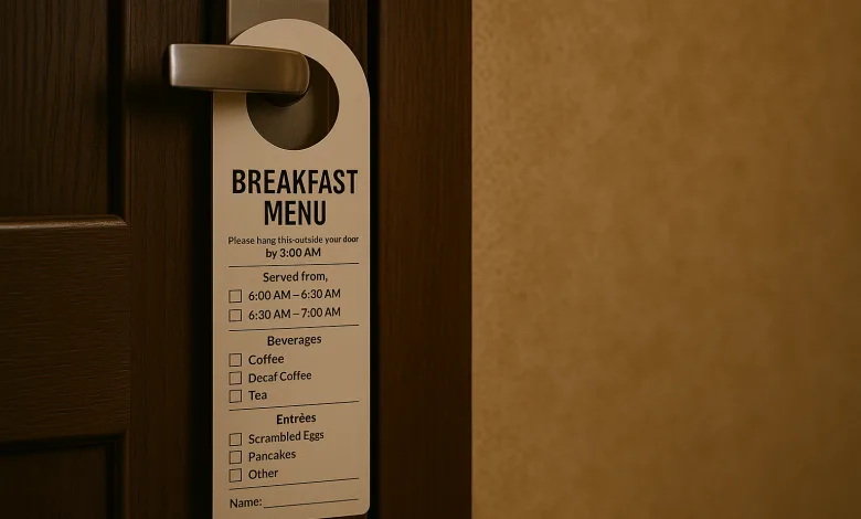 فكرة البطاقة بسيطة: يختار الضيف طلباته، يحدد وقت الإفطار، ثم يُعلّقها على الباب ليلاً. هذه اللمسة تنقل للضيف شعورًا بالتحكم والخصوصية، حيث لا حاجة للاتصال ولا للخروج من الغرفة. لكن حين يكون التصميم غير واضح أو معقّد أو متهالك من التكرار، فإن الأثر ينقلب من راحة إلى إرباك.