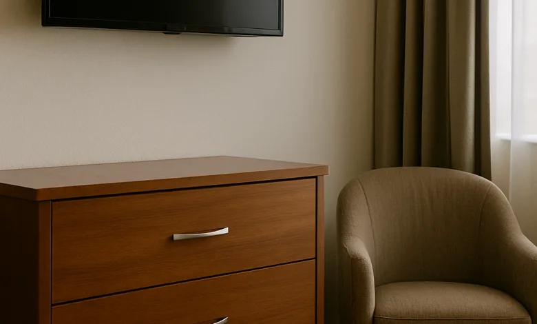أفضل موقع للتلفاز هو ذاك الذي لا يُضطر النزيل لتعديل جسمه أو تحريك رقبته بشكل مستمر أثناء المشاهدة. ومع ذلك، لا تزال بعض الغرف تضع التلفاز بزاوية جانبية حادة بالنسبة للسرير، أو على ارتفاع لا يتناسب مع مستوى النظر أثناء الجلوس. والنتيجة: إحساس خفي بعدم الراحة، وإن لم يُفصح عنه الضيف صراحة.