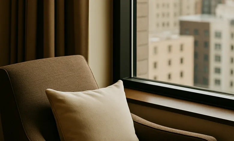 زاوية الجلوس بجانب النافذة تعمل كمنطقة وسيطة بين الغرفة والعالم الخارجي. فهي تمنح الضيف فرصة لمراقبة المدينة أو الطبيعة من خلف الزجاج، دون الحاجة إلى الخروج فعليًا من مساحة الراحة. وجود مقعد مريح أو ركن مصمم خصيصًا بجوار النافذة يجعل النزيل يشعر وكأنه يمتلك “شرفة داخلية”، ما يخلق إحساسًا بالانفتاح على المحيط الخارجي مع الاحتفاظ بحدوده الآمنة.