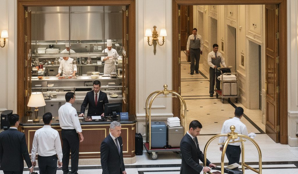 تقوم عمليات الفندق الفعالة على عدة أعمدة رئيسية متشابكة. القسم الأمامي Front Office هو واجهة الفندق والمركز العصبي للتواصل المباشر مع الضيوف، حيث تدور أنشطة مثل الحجوزات، والاستقبال، والإرشاد، وخدمة الكونسيرج. قسم الإقامة Housekeeping هو حارس معايير النظافة والترتيب الذي يؤثر بشكل مباشر على التصور العام للجودة.
